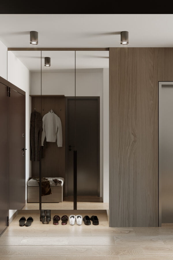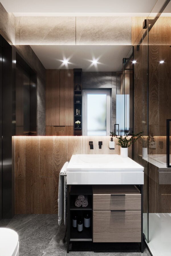 Both bathrooms have a modern design, with a special emphasis on lighting and practicality. The combination of tiles with wood texture and light neutral tiles makes them feel more spacious. Attention to detail contributes to the overall ambiance of the apartment.
