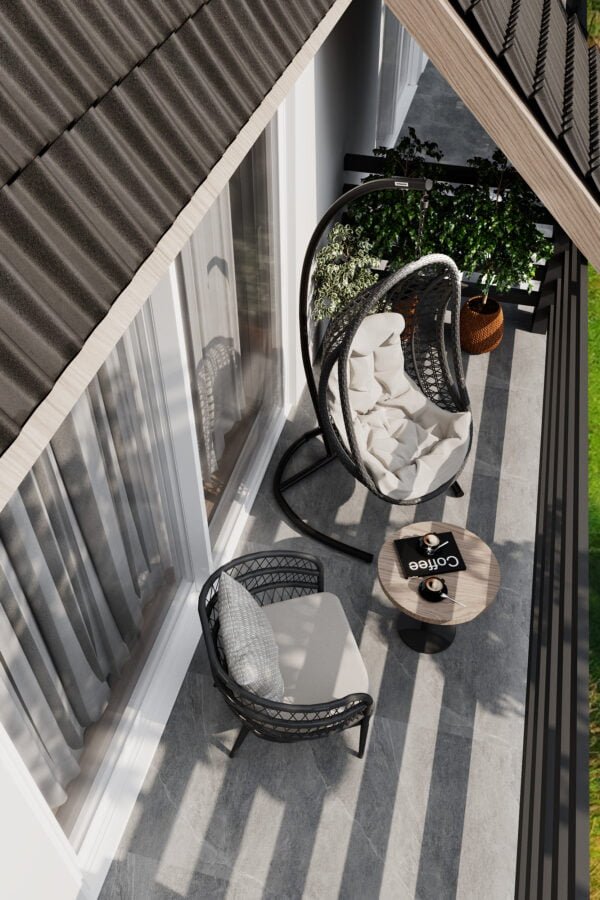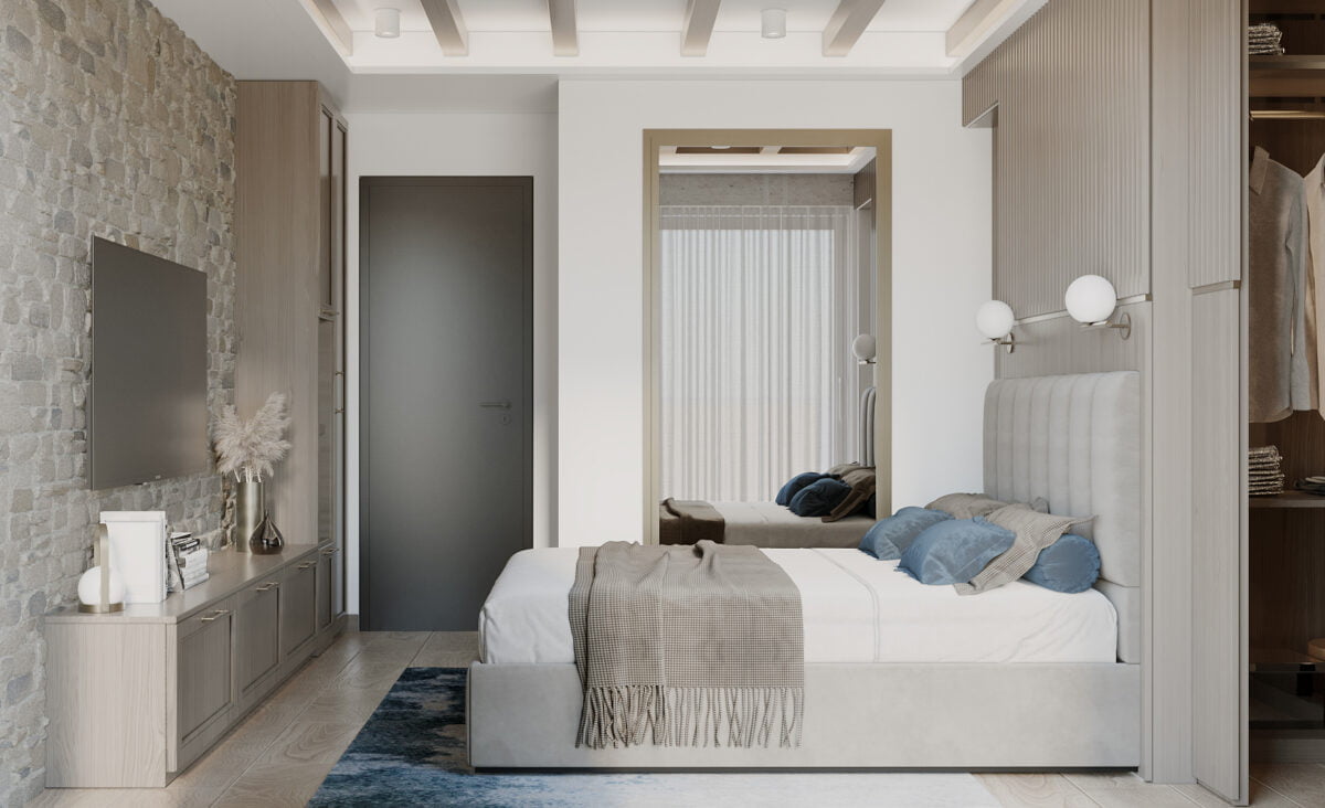 The apartment is double/oriented with french windows that offer a splendid view of nature and the surroundings. Besides connecting the interior with the environment, these windows are crucial for the layout of the space as they significantly impact the organization. The apartment consists of an entrance hall, a daily bathroom, a living room with a kitchen and dining area, a master bedroom with a walk-in closet, a children’s room, a shared bathroom, and a terrace.