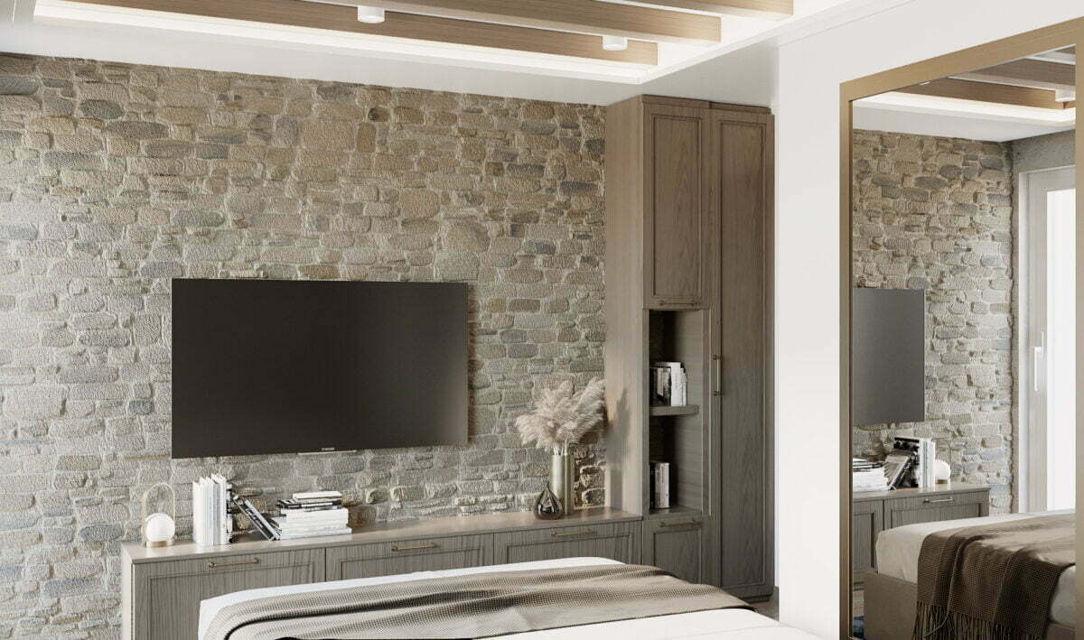To achieve the desired atmosphere, we decided on a combination of two natural materials typical for mountain houses – local stone and wood. The dining room wall, as well as the area around the fireplace and the bedrooms, is covered with stone. Other walls in the living room are clad with wood fronts and black stone for the worktop.