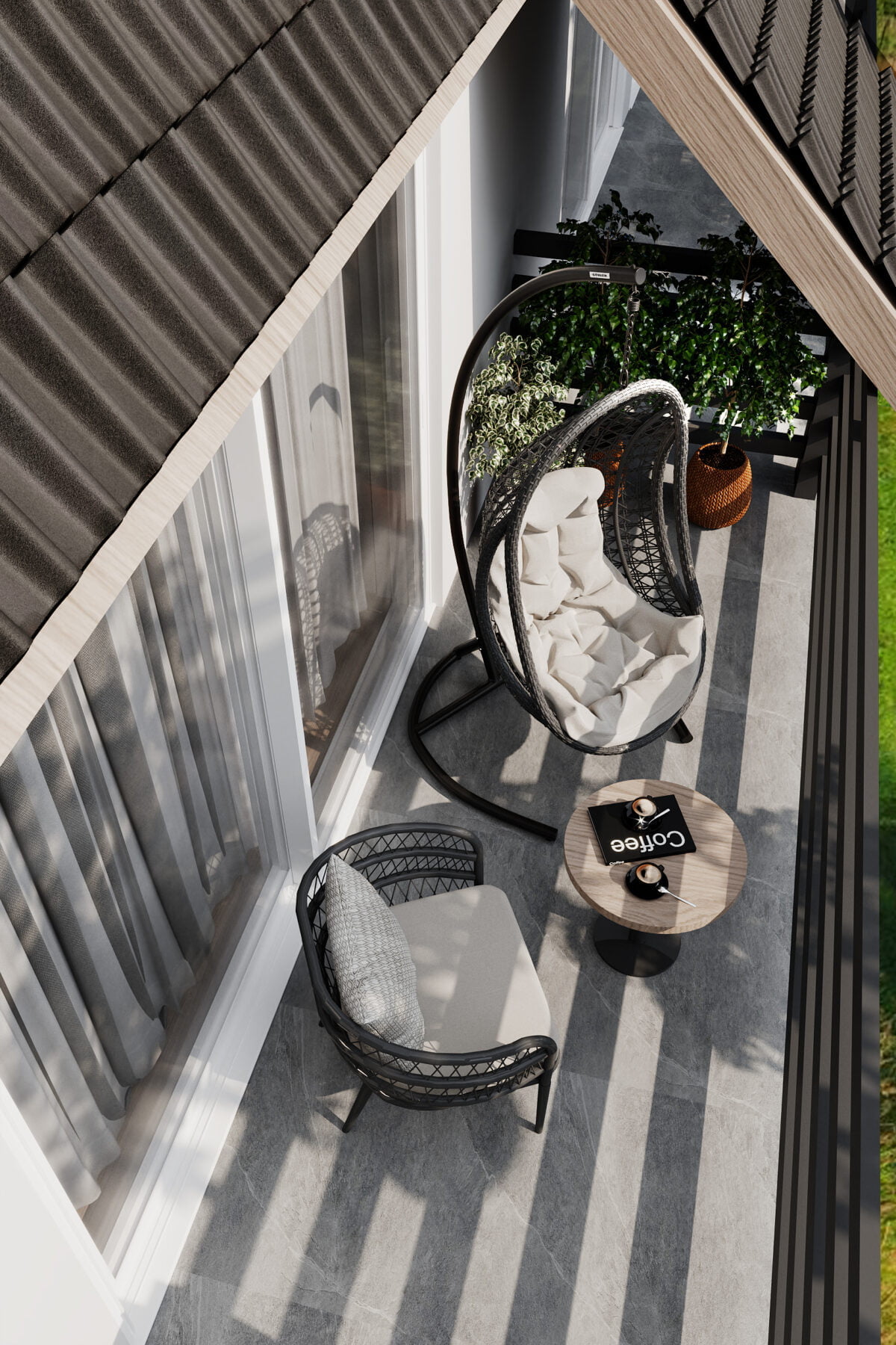 The master bedroom has an interestingly designed headboard that also serves as a partition between the room and wardrobe. Lighting was carefully chosen to create a relaxing atmosphere. Additionally, the master bedroom has its own access to the terrace.