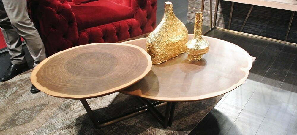 Rounded coffee tables will never go out of style. This time, the emphasis was on the interesting choice of materials and other details. We’ll single out three distinctive trends in this fashion: high gloss tables with an elevated edge (photos 1 and 2), tables with a distinctive wooden structure (4) and tables with both distinctive wooden structures and edges (3).