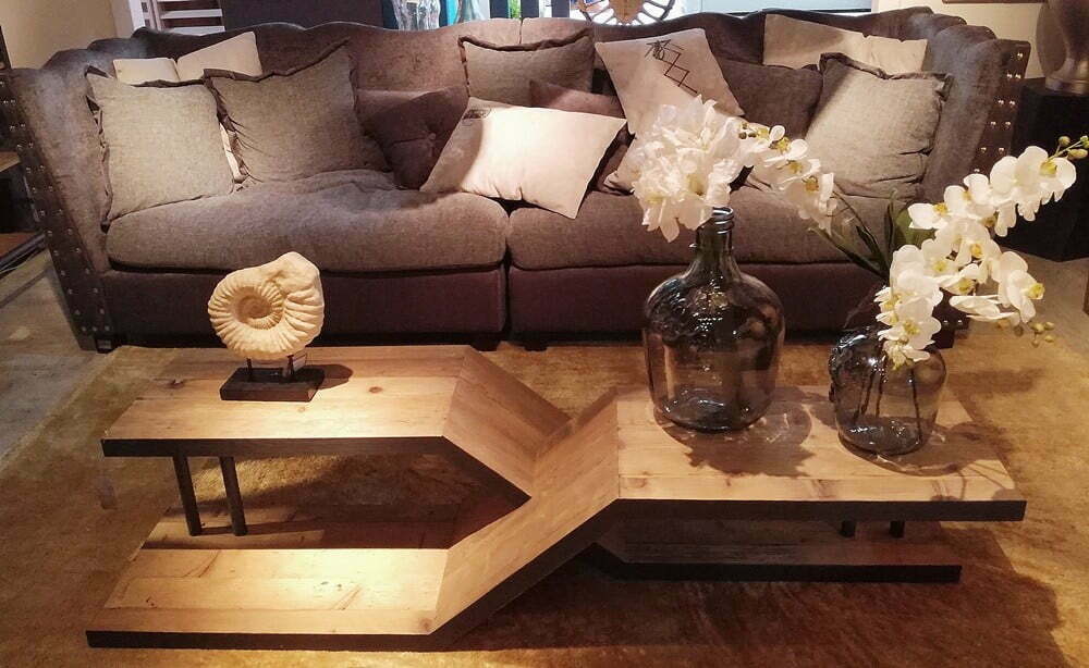 Coffee tables of various shapes with the upper edge of two integrated panels are very popular this year.