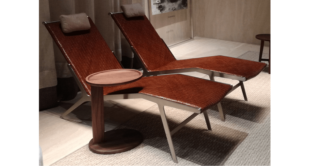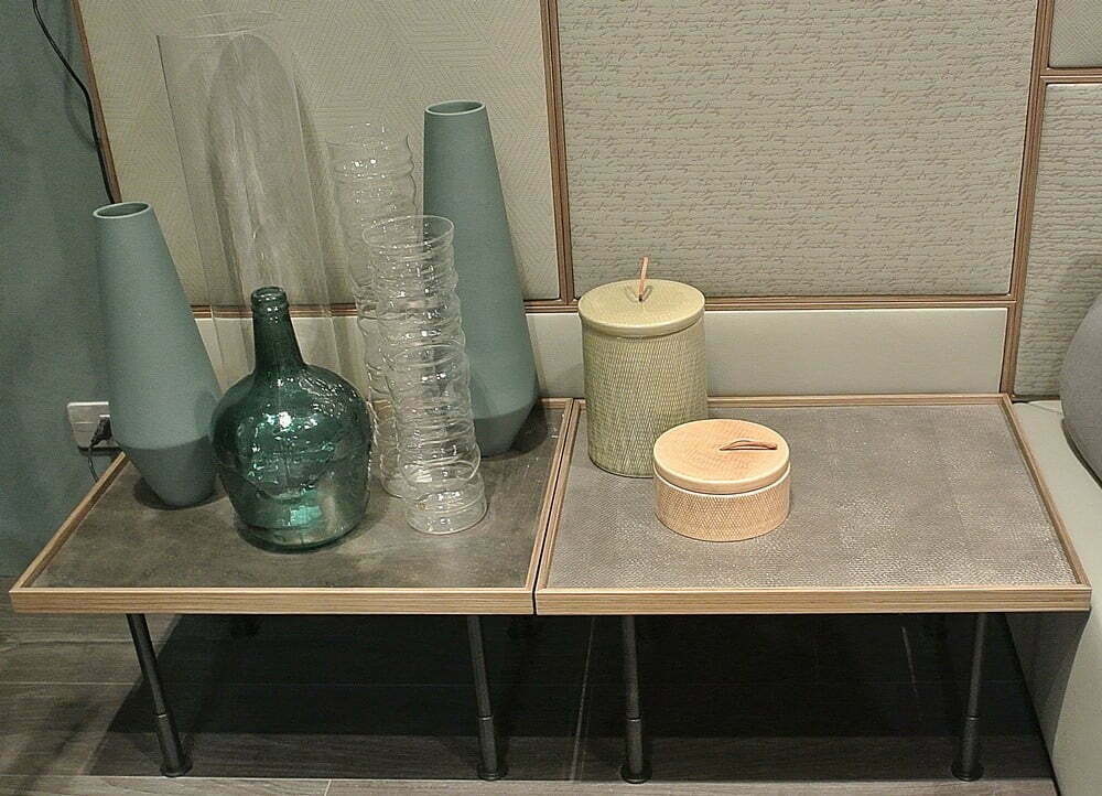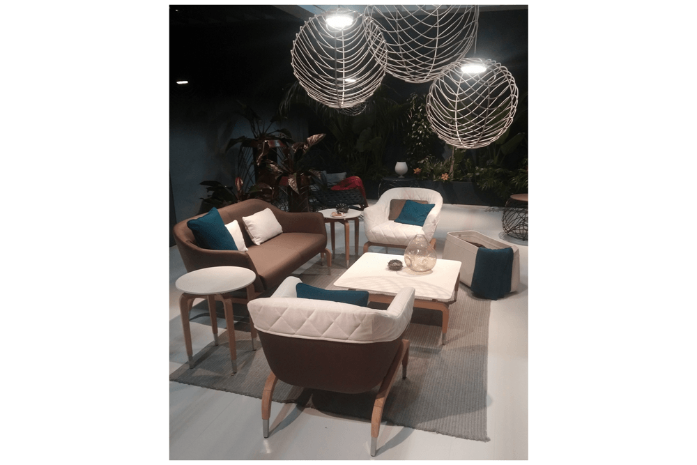 At several booths, we saw a quite convenient trend where two separate tables share a print, so they can be used combined or separately. There are also club tables of various shapes and structures often intertwined in interesting combinations.