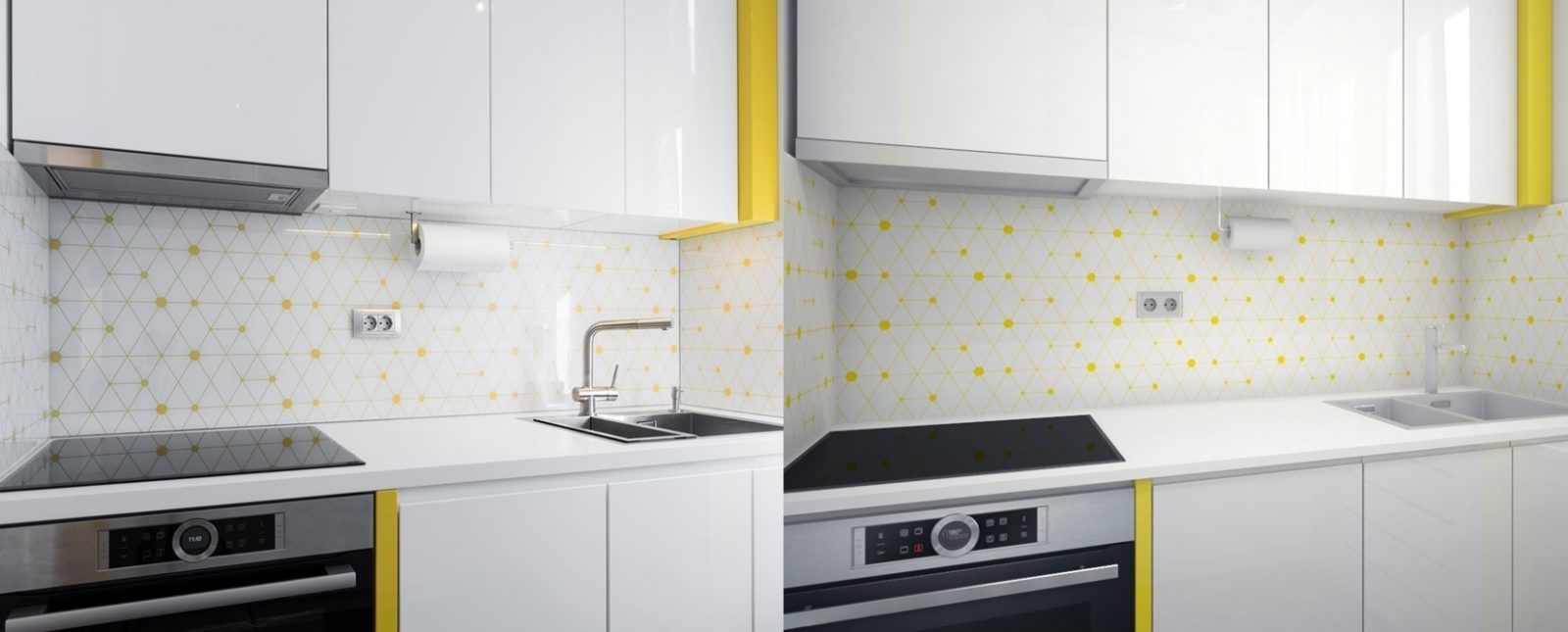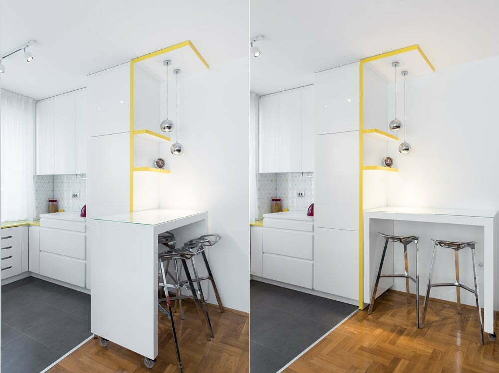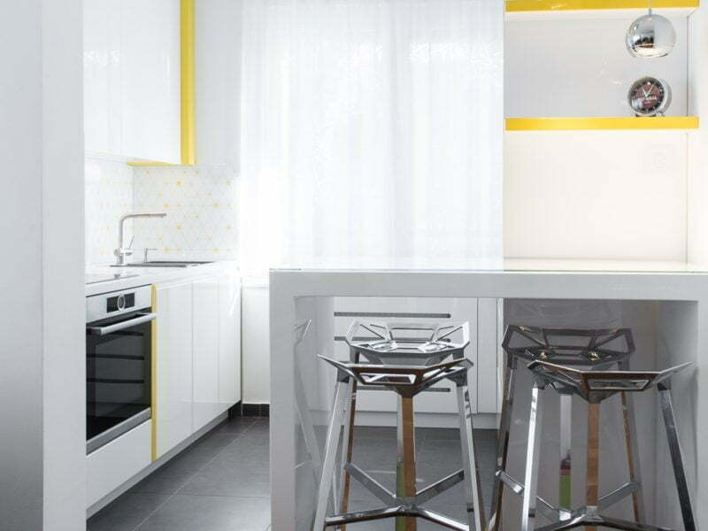 Ograničen prostor predviđen za kuhinju trebalo je iskoristiti na najbolji način, te smo se vodili idejom da ga pažljivim odabirom oblika i boja što više otvorimo i učinimo prozračnim. Tome je najviše doprinela kombinacija žute i bele, kao i poigravanje sa geometrijskim šarama, što predstavlja temu koja se na nekoliko načina provlači kroz prostor. Uvođenjem žutih elemenata od medijapana visokog sjaja dodali smo dozu živahnosti u ovaj prostor, što ga svakako čini drugačijim od standardnih kuhinja ovog tipa.