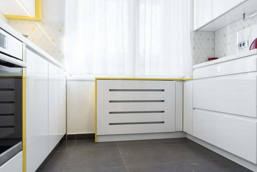 Pomalo otežavajuća okolnost pri dizajniranju ovog prostora predstavljao je nizak prozor na čeonoj strani kuhinje gde se nalazi i radijator, i gde nisu mogli da se stave dodatni kuhinjski elementi. No, ovaj izazov je prevaziđen postavljanjem unikatne maske za radijator koja je postala nova površina za privremeno odlaganje stvari i koji se nadovezuje na vodeću temu.
