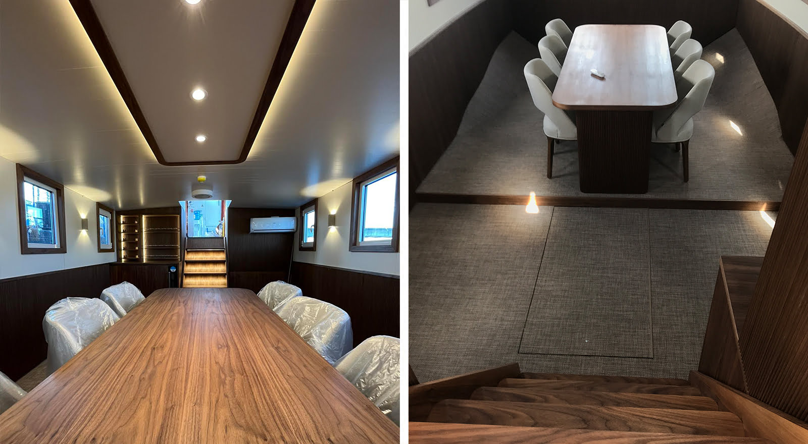Nismo zaboravili detalje – izložbene police za vina i čaše na način na koji se projektuju i na najluksutnijim jahtama, sto koji se može pomeriti kako bi se pristupilo brodskim mašinama ispod njega, televizor skriven u krmi za prezentacije, i direktna i indirektna rasveta koja stvara neodoljivu atmosferu tokom sumraka i večernjih plovidbi.