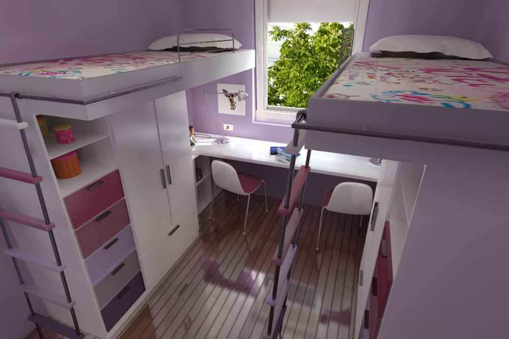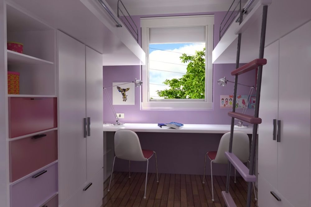 Druga soba koju bismo voleli da vam pokažemo je soba za dve male bliznakinje. I u ovom slučaju, manjak prostora se nametnuo kao najveći izazov, naročito zato što se radi o prostoru za dve osobe. Rešenje smo videli u visini prostora, pa smo se trudili što bolje da je iskoristimo.