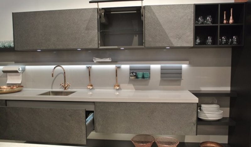 Fantastično kuhinjsko ostrvo koje vidite na slici gore jedno ne od mnogih praktičnih rešenja koje smo primetili u Milanu. Na ovom primeru vidite nekolicinu trendi elemenata na jednom mestu, kao što su skrivene drške i elementi od metala visokog sjaja.