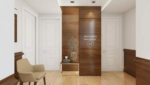 Prostor se, između ostalog, sastoji i od ulaznog hola pretvorenog u čekaonicu sa dve stolice i stočićem. U njemu dominira obložen dekorativni stub sa logoom kancelarije. U kancelariji za pripravnike nalaze se tri mesta, te veliki orman za odlaganje slučajeva. Dve kancelarije za advokate opremljene su udobnim nameštajem, kako za zaposlene tako i za stranke. Ergonomski dizajnirane fotelje u smeđoj boji odlično se uklapaju u prostor a istovremeno olakšavaju višesatno sedenje zaposlenih.