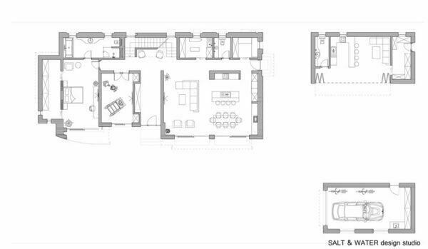 Tendencija da se od samog starta uradi po principima energetske efikasnosti potekla je od naše klijentkinje. Enterijer kuće uređen je u modernom stilu i odiše luksuzom i komforom. Ideja je bila da se organizuje prostrani centralni prostor za dnevni boravak u koji je uključena kuhinja, trpezarija i dnevna soba. U dizajn smo implementirali i ideju spajanja spoljašnjeg okruženja sa enterijerom, pa se tako veliki stakleni paneli na južnoj strani mogu otvoriti i spojiti sa delom dvorišta predviđenim za opuštanje po lepom vremenu.
