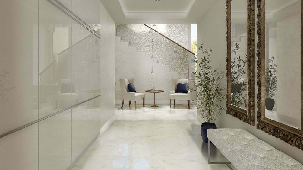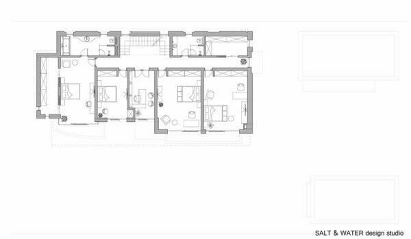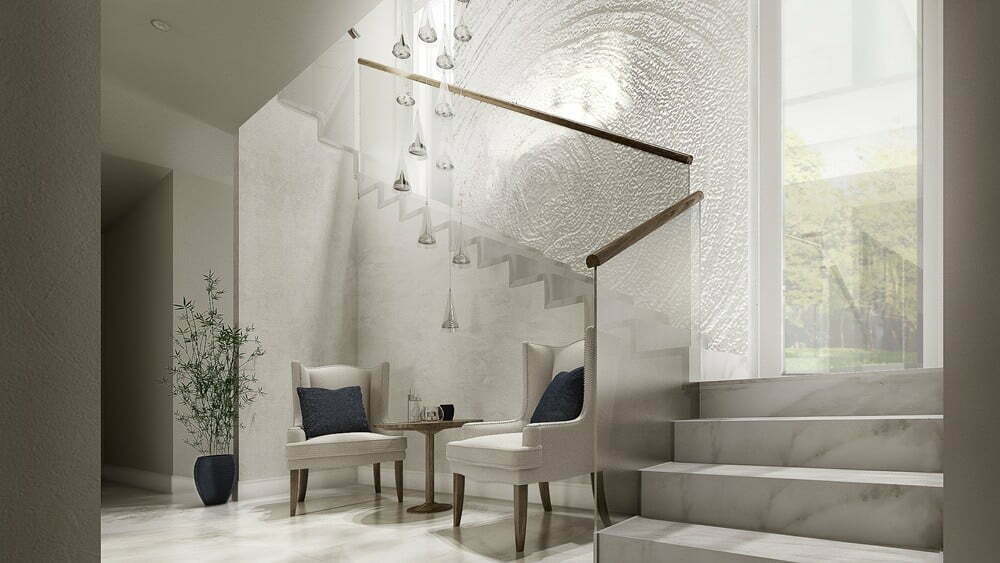 Pored centralnog prostora, u prizemlju se nalaze ulazni hol, soba za vežbanje, spavaća soba sa prostranim garderoberom i kupatilom, toalet, ostava i vešernica. Do prvog sprata dolazi se pomoću stepenica čiji su zidovi pretvoreni u dekorativne površine i zajedno sa rasvetom čine simpatičnu lounge zonu opremljenu luksuznim nameštajem. Ovaj prostor može se koristiti i kao svojevrsna čekaonica za saradnike sa kojima radi naša klijentkinja, budući da se na spratu nalazi njena kancelarija.