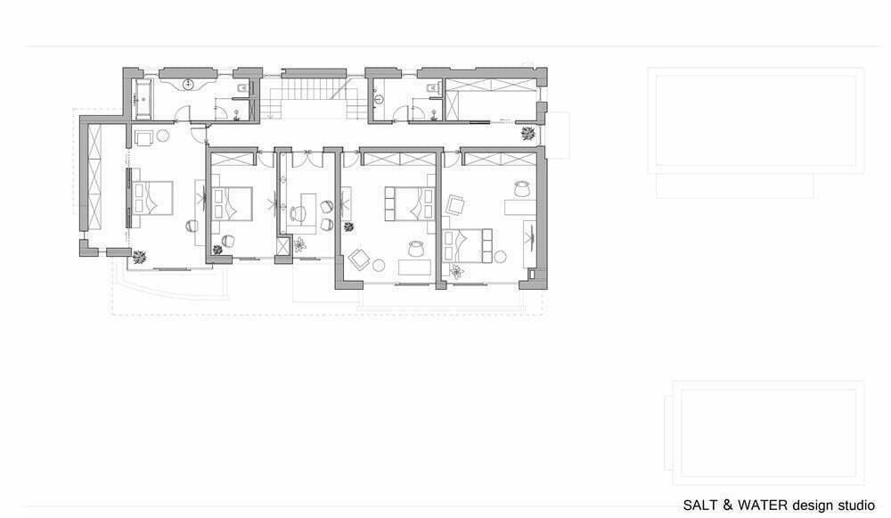 Pored pomenute kancelarije, na spratu se nalazi master spavaća soba sa velikim kupatilom i garderoberom, tri spavaće za ostale članove proširene porodice, kupatilo i dodatna ostava.