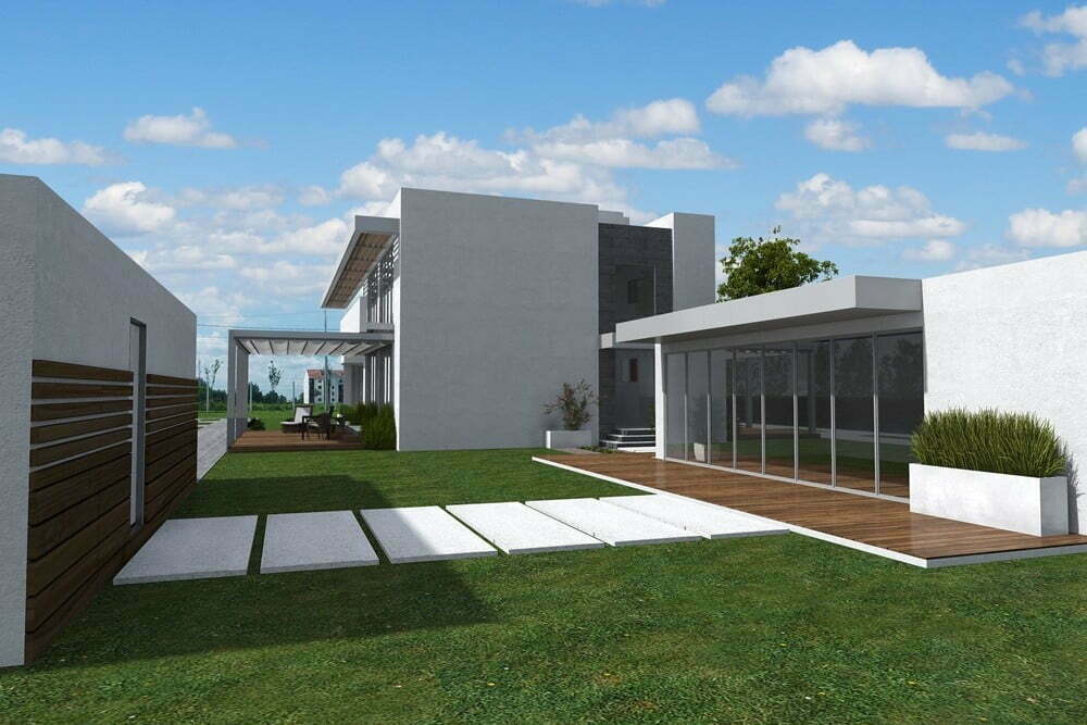 Dodatni objekti na placu su garaža i prostrana letnja kuhinja. Letnja kuhinja može da zadovolji potrebe proširene porodice, a sadrži kuhinju sa trpezarijom i skladištem. Ispred prednje fasade na poziciji gde se nalazi dnevna soba, predviđeno je mesto za sedenje i odmor u bašti sa automatizovanom tendom na rasklapanje. Na nekoliko pozicija na fasadi glavnog i pomoćnih objekata nalazi se i dvorišno osvetljenje. Ono poseduje senzore koji registruju pokret. Predviđeno je da će na placu biti ugrađena toplotna pumpa sa geotermalnom sondom koja obezbeđuje podno grejanje sa automatskim hlađenjem.