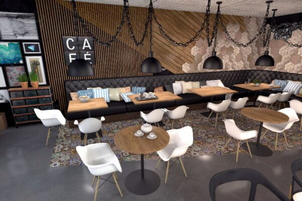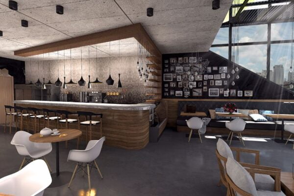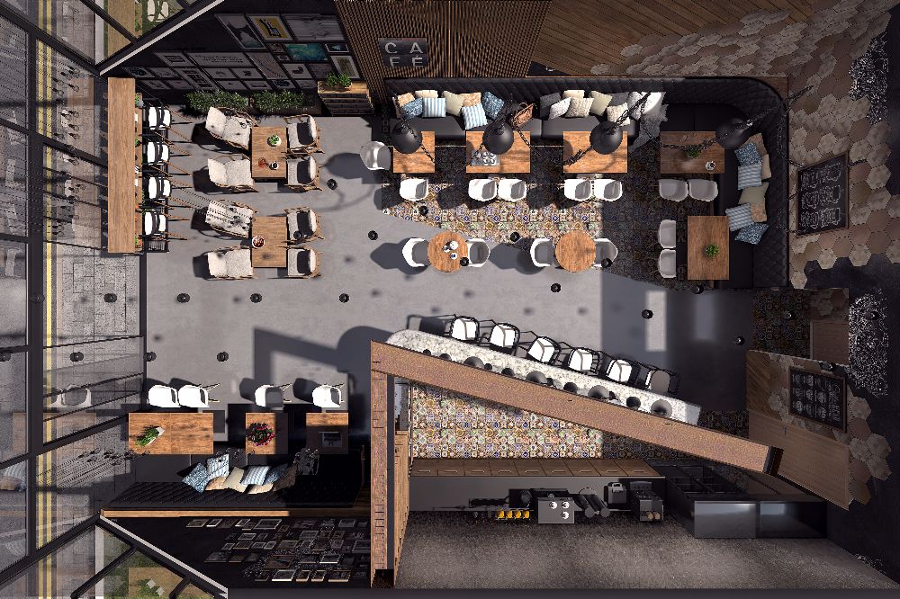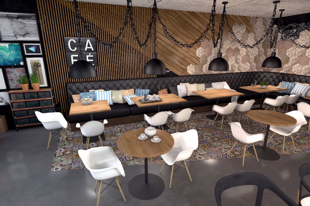 Enterijer jednog kafića u užurbanom centru velikog grada bio je prazno platno za naše ideje. Ovo mesto je zamišljeno kao idealna lokacija za ručak i kafu tokom kratkih pauza na poslu. Mi smo mu udahnuli industrijski izgled kakav je vlanik želeo, ali “ublaženu” varijantu. Pogledajte kako je to izgledalo.