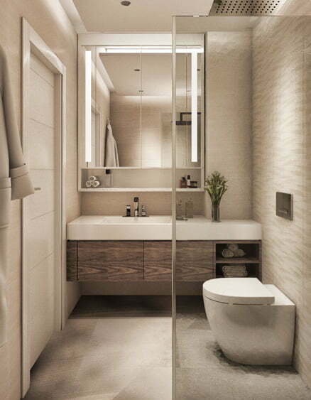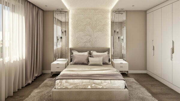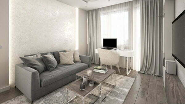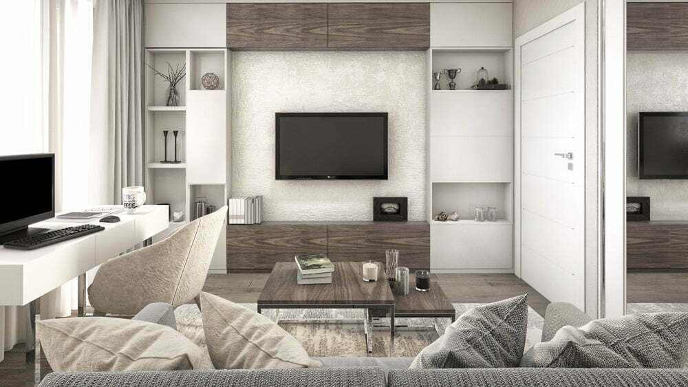 Rušenjem zida između kuhinje i trpezarije stan je podeljen u dve zone. Dnevnu zonu čine kuhinja, trpezarija i dnevna soba spojene u jednu celinu. Noćna se sastoji iz više izdvojenih i ušuškanih prostorija. Neutralne svetle boje učinile su prostor većim i prijatnijim, dok taman parket unosi zanimljiv kontrast.