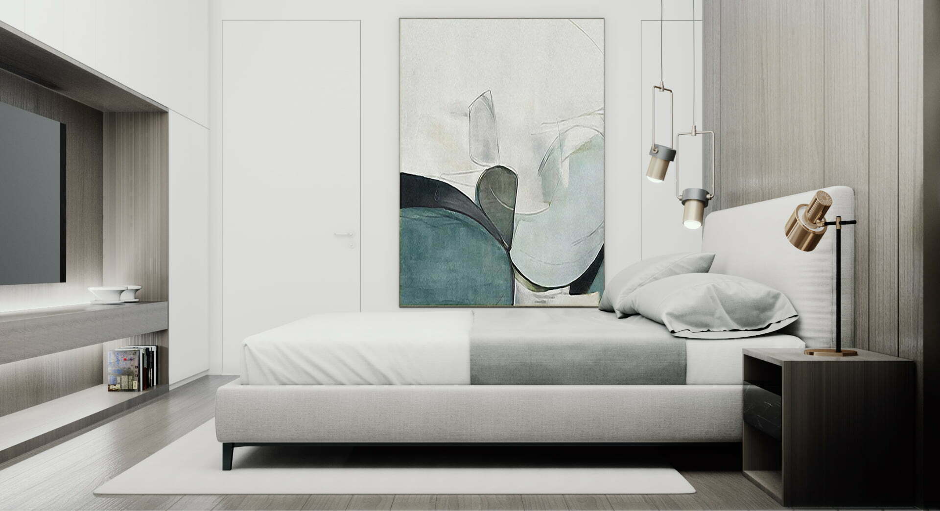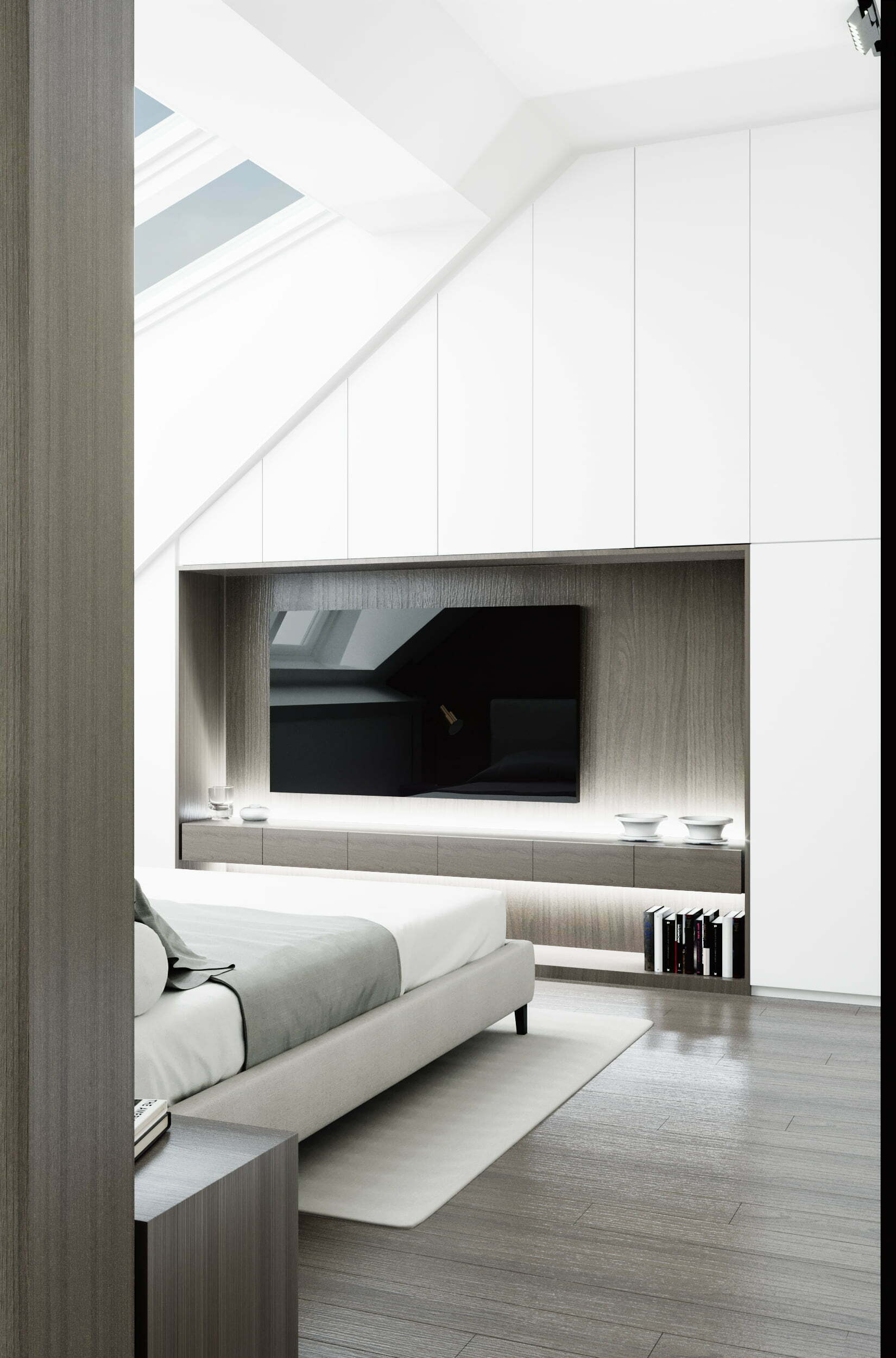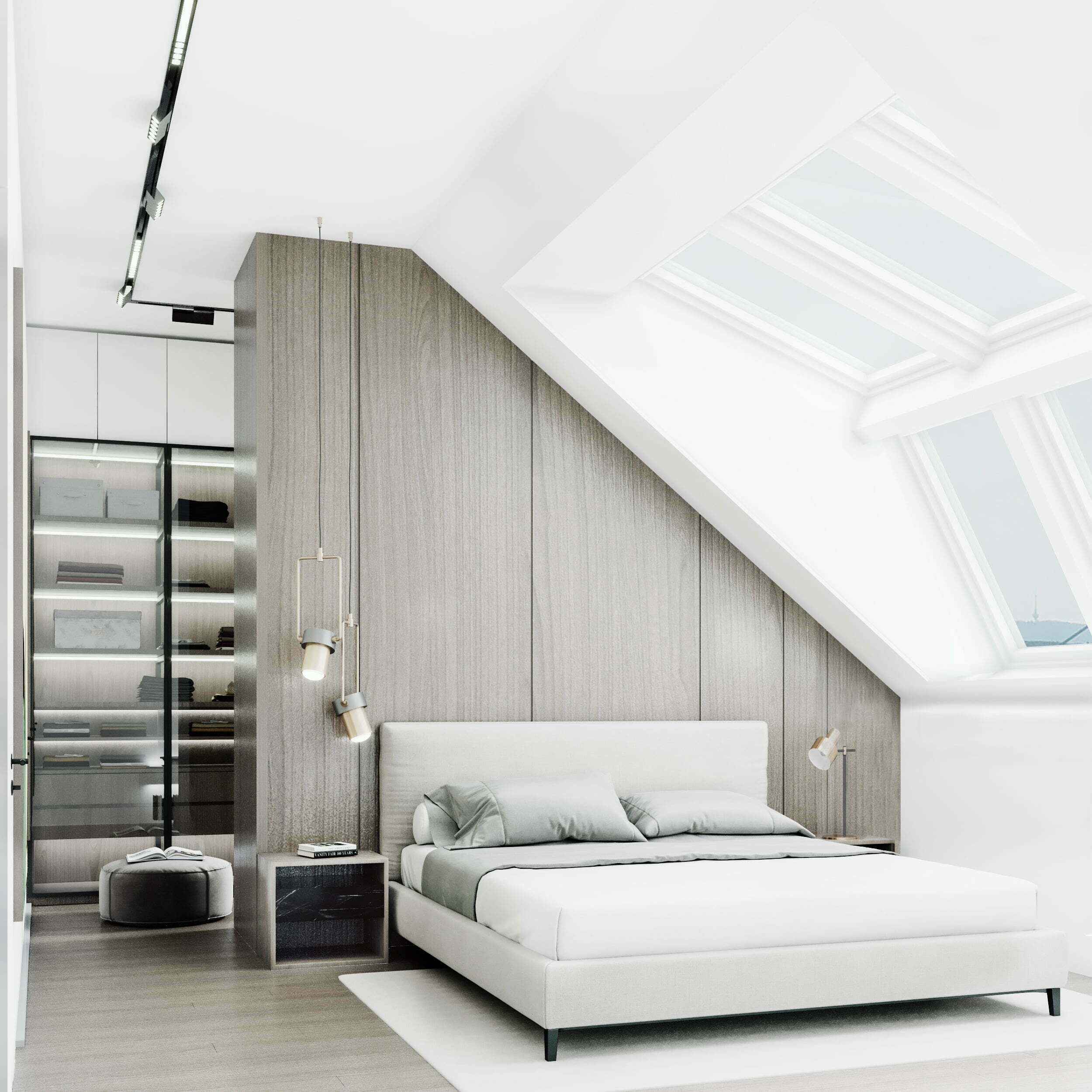 Krovnih prozora, i to čak šest u dva reda, ima i u master sobi. Na taj način ona je potpuno povezana sa nebom i prirodom. Zanimljivost u njoj je nepravilna geometrija uzglavlja koju smo naglasili izborom rasvete. Nepravilna je i geometrija zida naspram kreveta i to smo balansirali izborom masa i oblika. Pored kreveta smo dodali tepih koji ovaj deo stana taktilno i vizeulno čini mekšim, a svedenu geometriju razbili smo slikom na zidu iz koje zrače pokret i radost.