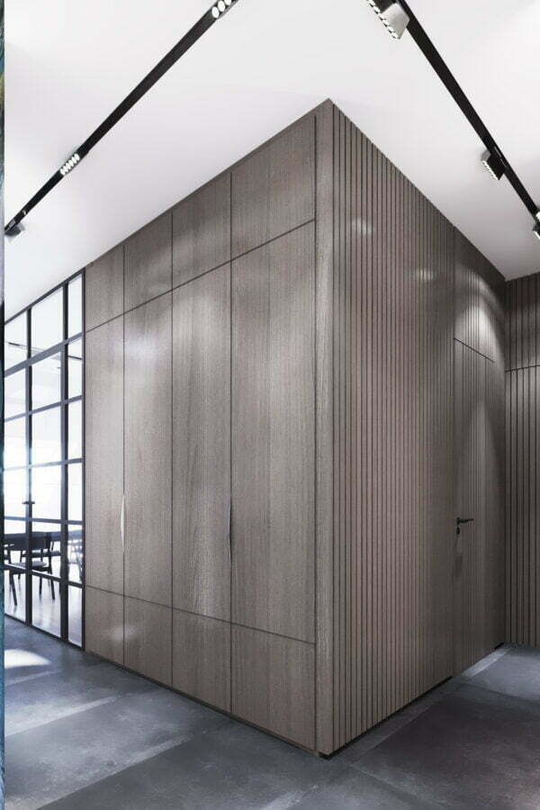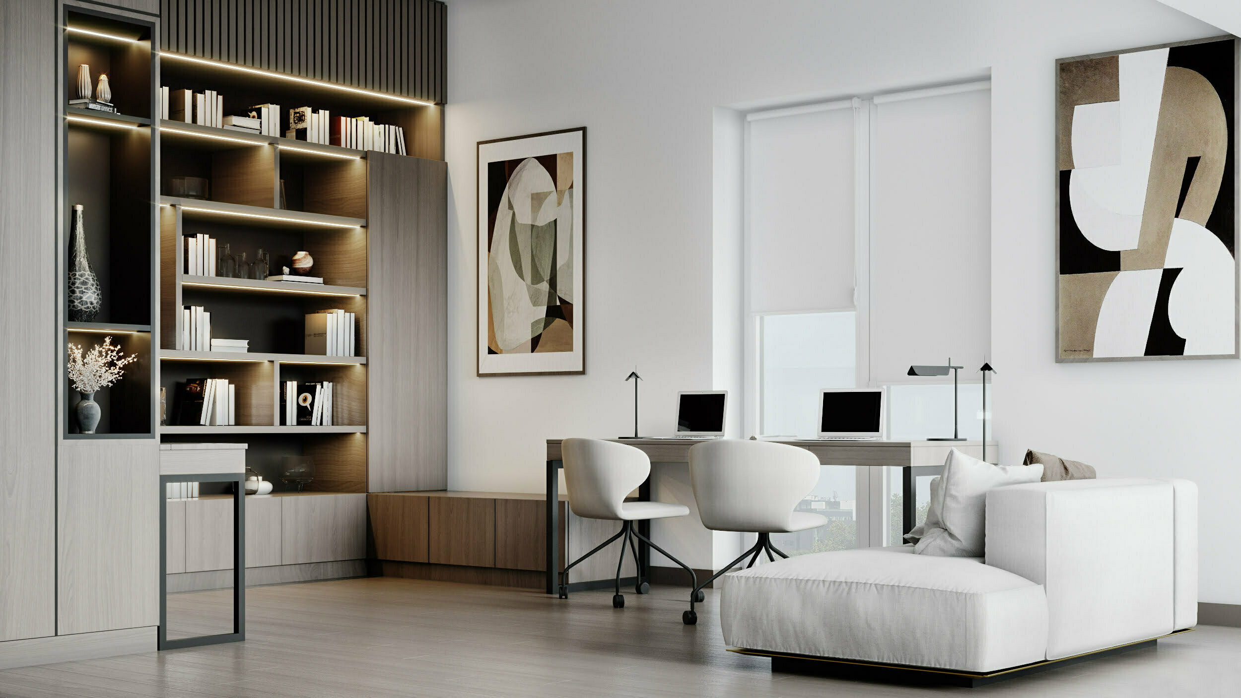 Prostor je maksimalno iskorišćen i u radnoj sobi. U njoj naši klijenti provode mnogo vremena u toku dana, što smo imali na umu tokom projektovanja. Zato smo se potrudili da obezbedimo sve uslove za rad u miru – jednostavan radni sto za dvoje i kauč. Jedan deo sobe je zauzela specifična celina sastavljena od ormana i stola za šminkanje.
