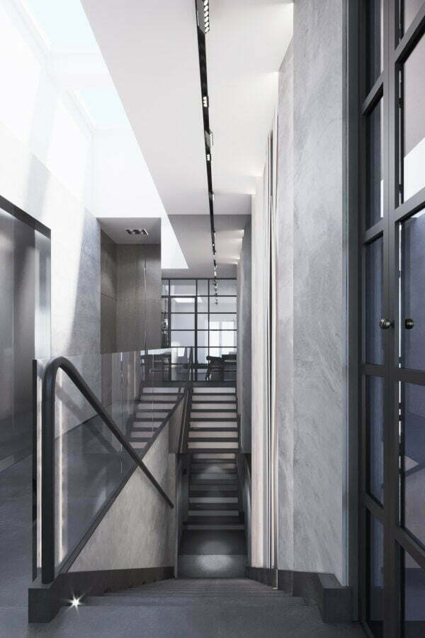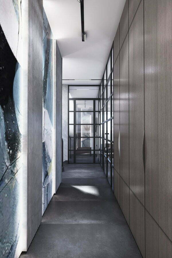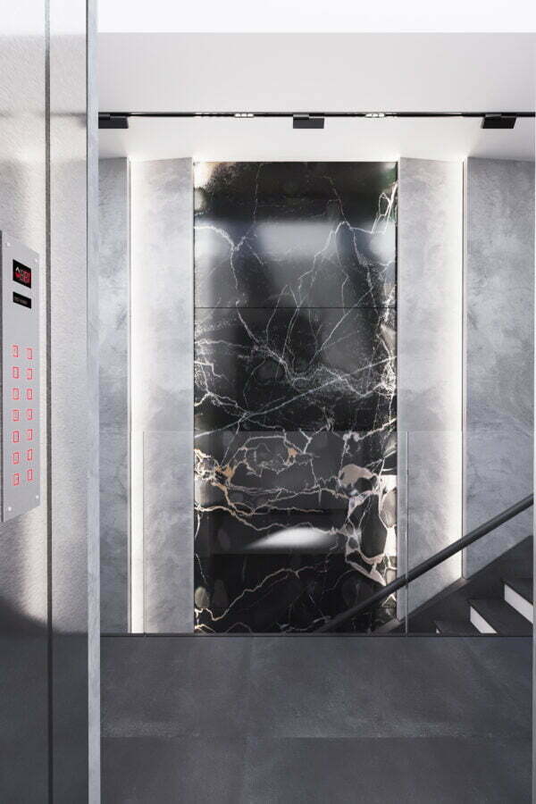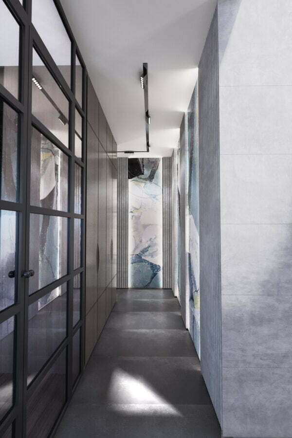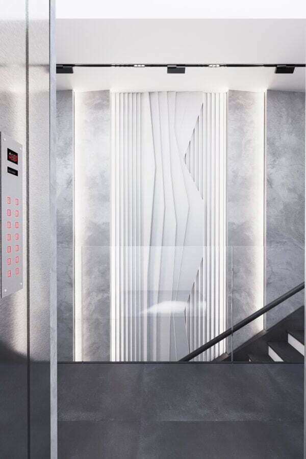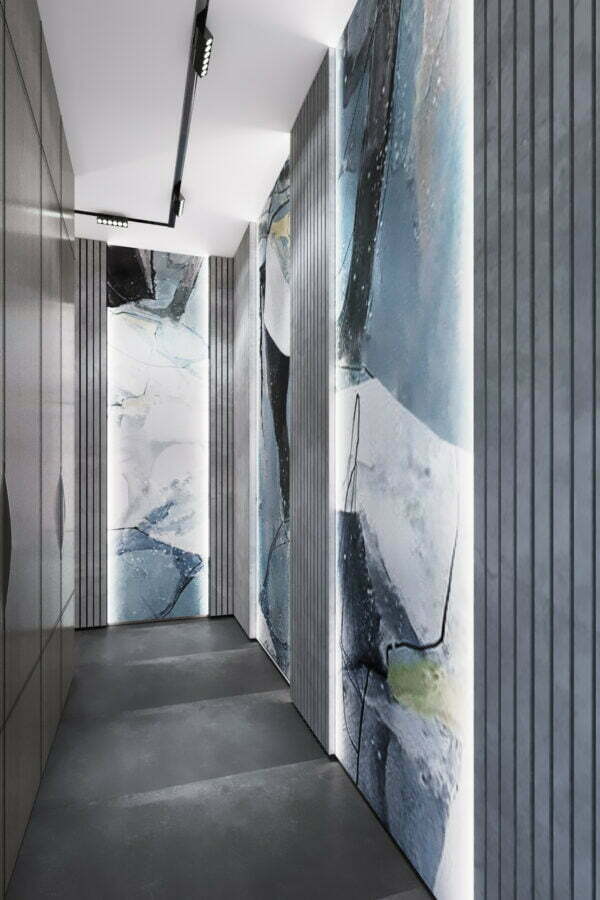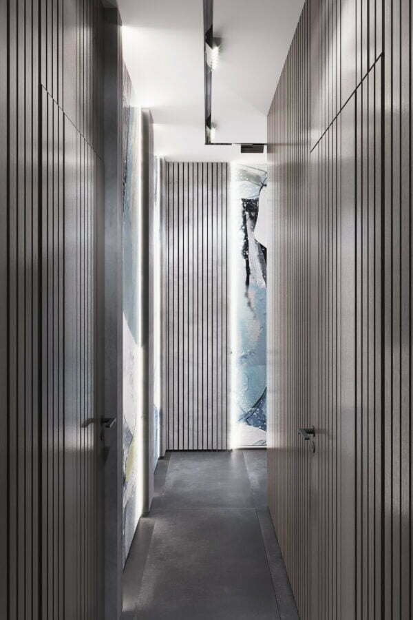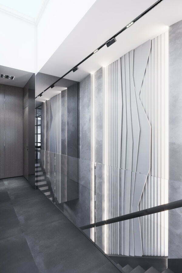 Skulputalni zid, efektan a lak za održavanje, našao se u ulaznom holu. Iza obloge na zidu sakriveni su vešernica i ulaz u dnevni toalet, a tu je i veliko ogledalo koje nije samo praktično, već i daje dubinu prostoru. Interesantan deo ulaznog hola predstavlja kvadriptih slika koje su ugrađene u oblogu. Stepenište koje vodi do stana je privatno, pa smo odlučili da ceo zid hola okrenut ka njemu bude u staklu. Tako je prostor istovremeno i atraktivniji i vizuelno veći.