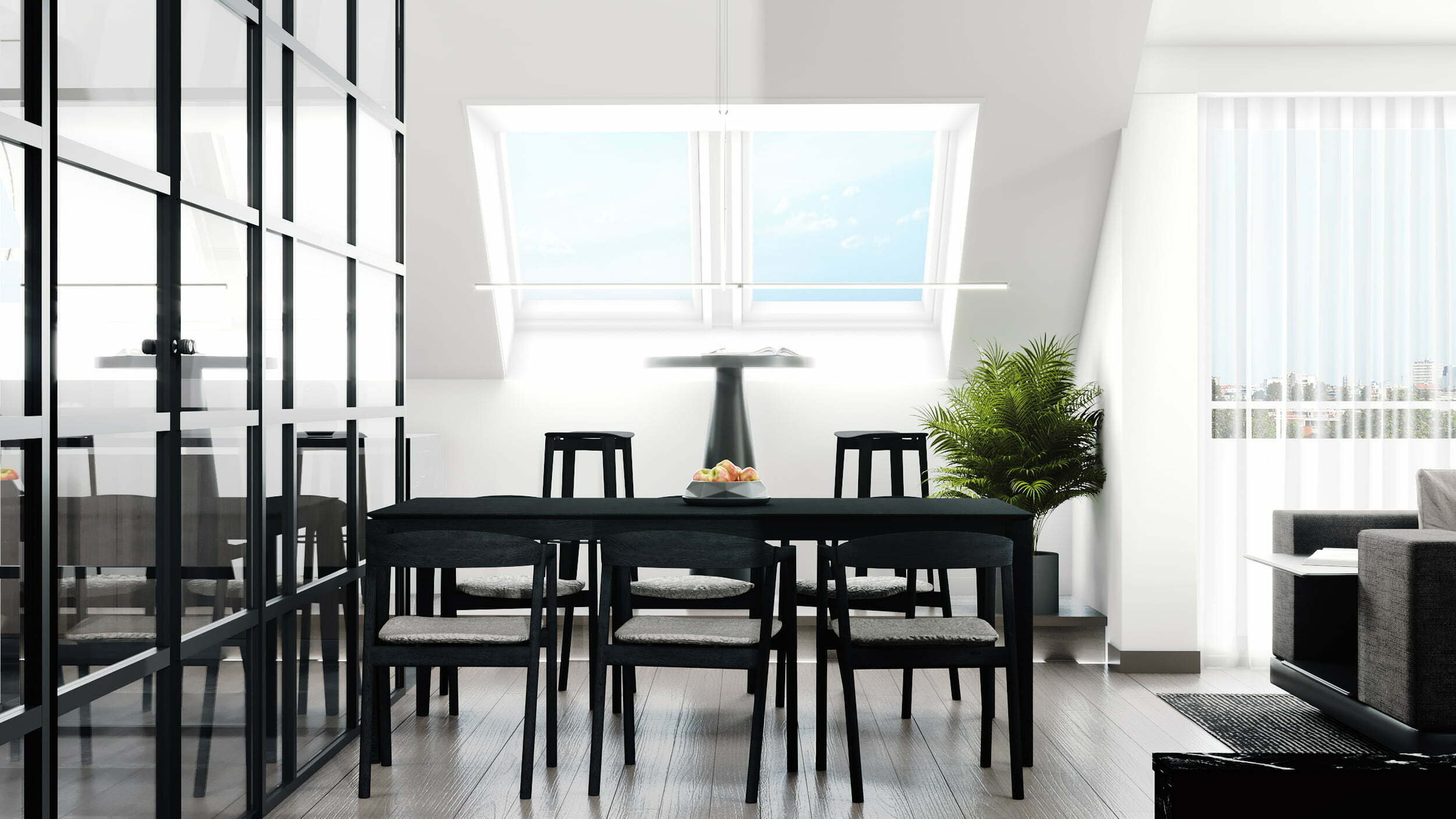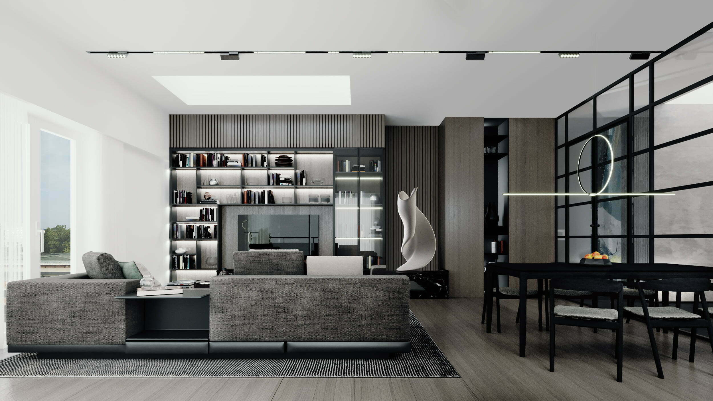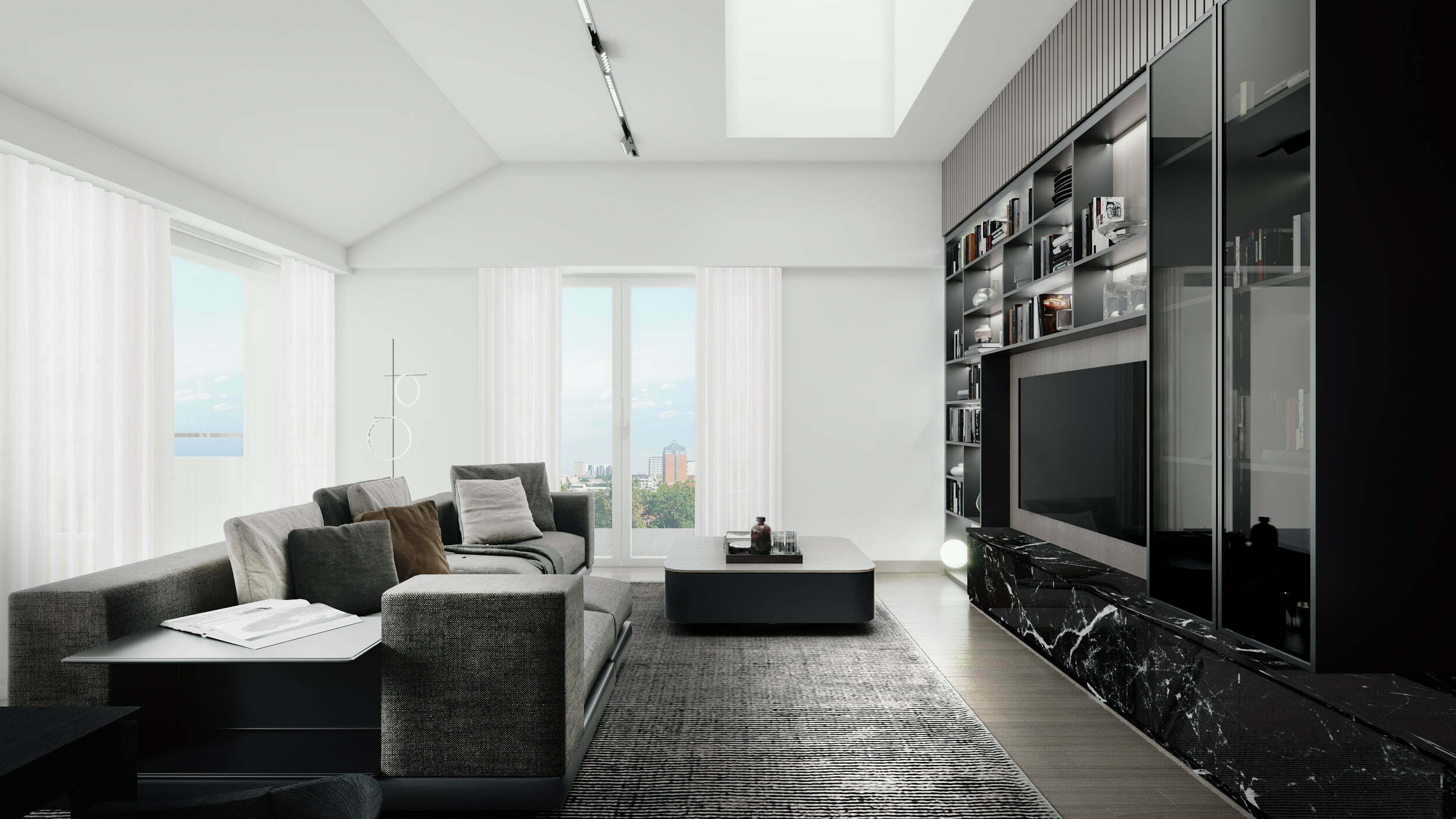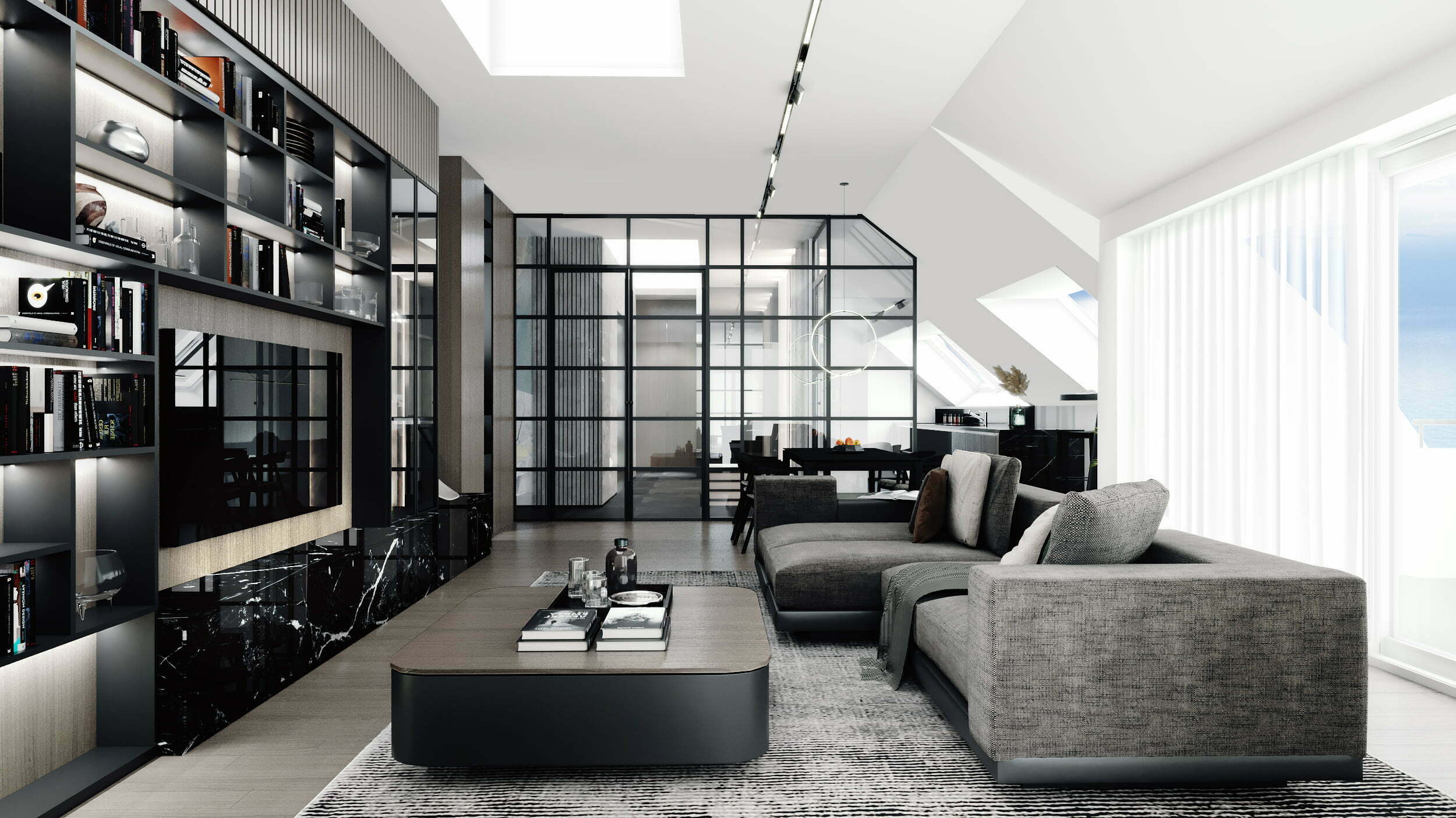 Naspram njih je kao savršena protivteža zid prekriven policama različitih tekstura – na njima se prepliću drvo, kamen, metal i staklo. Jasno je da dnevna soba asocira na spokoj. Takva je i njena paleta boja – uključuje tek belu, crnu, sivu i boju drveta. Pretežno pravougaoni oblici podsećaju um na red. Kontrast je samo statua oblih formi koju smo postavili u nišu nastalu tokom projektovanja nadogradnje. Mnogo prirodne svetlosti dozvolilo je nameštaj tamnih boja.