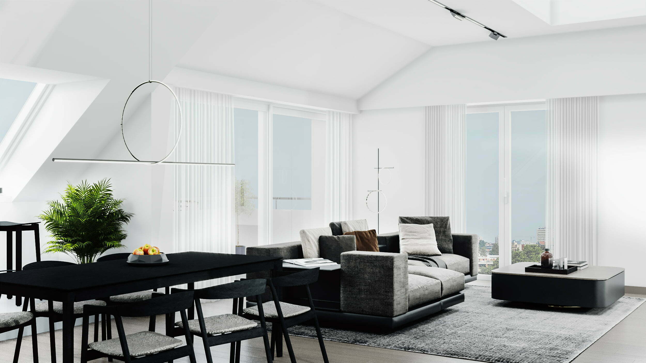Dnevna soba je okupana sunčevom svetlošću zahvajujuči krovnoj kupoli, portalima i krovnim prozorima koji je obilato unose u prostor. Dodatnu otvorenost daju transparentne pregrade koje samo artikulišu prostor, ne ograničavajući ga. Svetlom dnevnu sobu čine i prazni, beli zidovi.