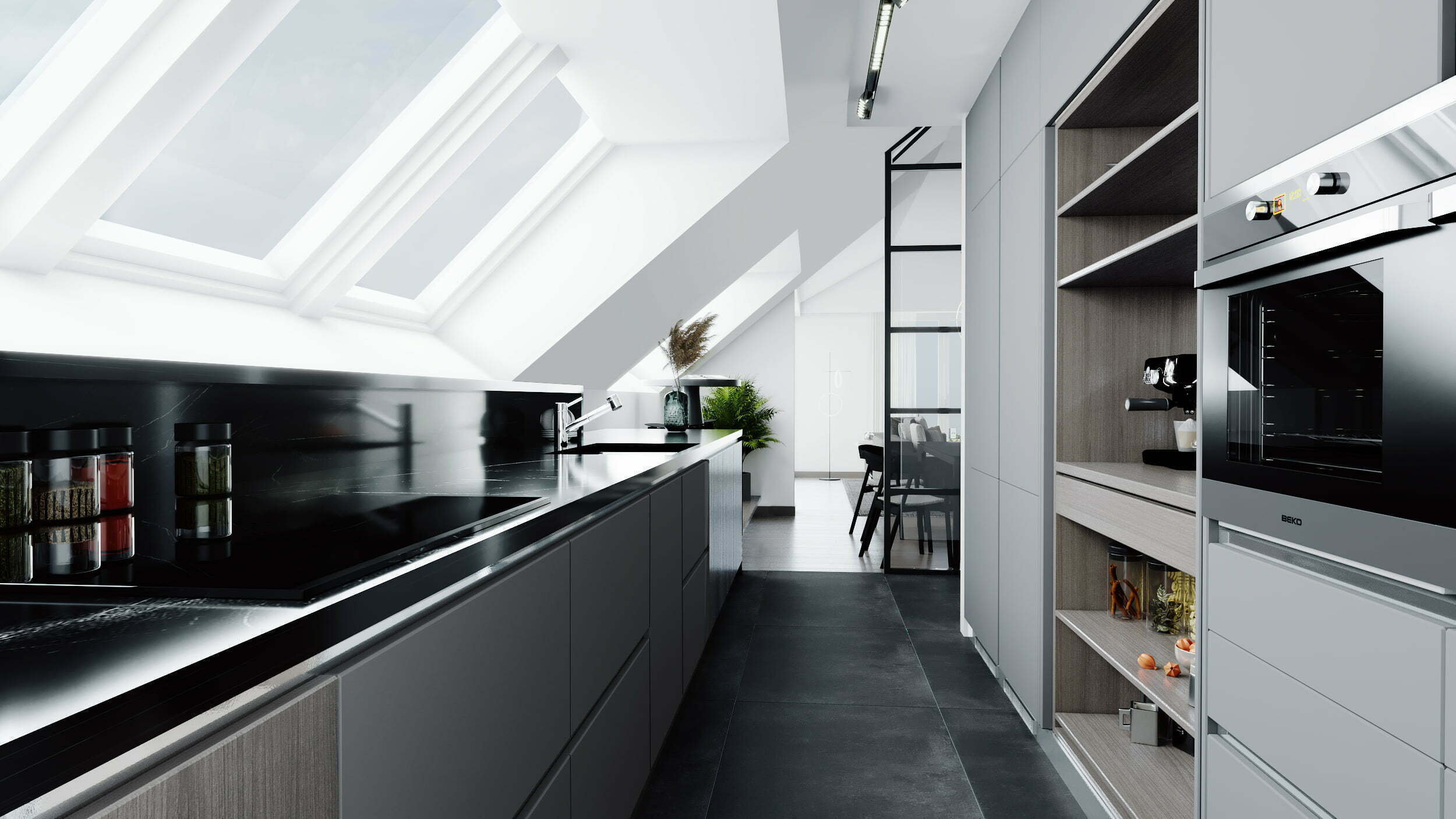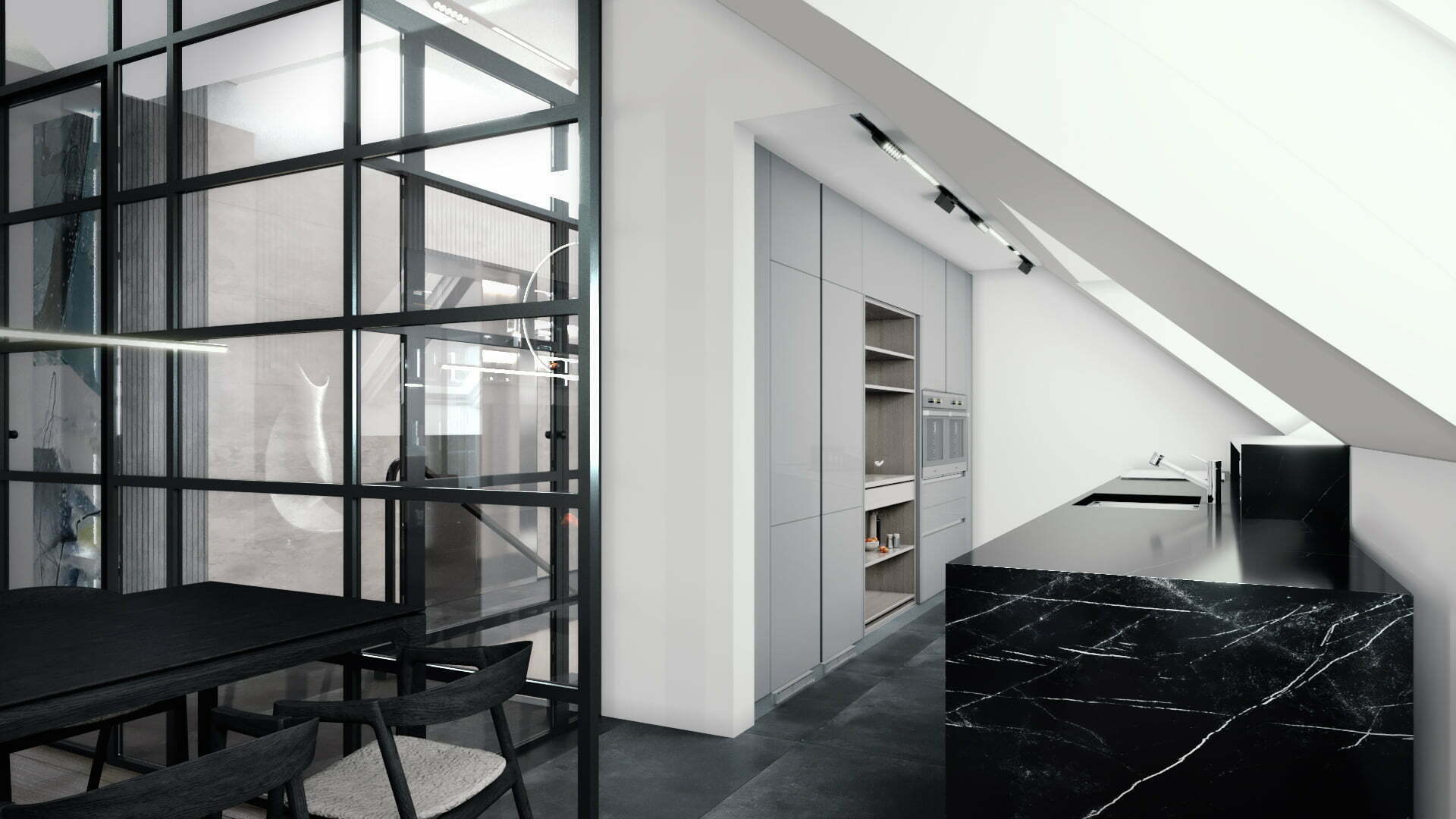 Funkcionalnost kuhinje ogleda se u delu ormana sa kliznim vratima koji služi za sakrivanje svakodnevno korišćenih uređaja. Iskoristili smo svaki deo prostora na odgovarajući način – niži deo prostorije ispunjen jeradnom površinom, a viši služi za ostavni prostor sa ugrađenom tehnikom. Praktično je imati i dva kutka u kuhinji – jedan u kome par može brzo obedovati i drugi, sa stolom za formalnije obroke i više ljudi.