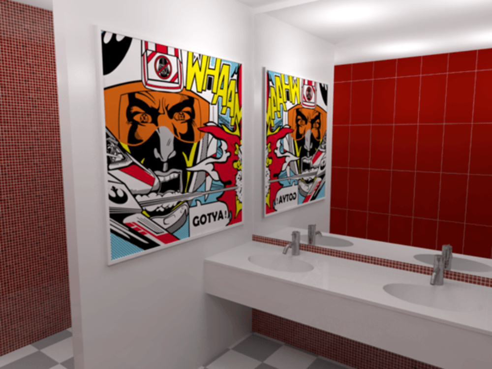 What you see before you is our interpretation of a pop art inspired interior design. This way, simple facilities like a male and female bathrooms in a mid-size office gets a perfect makeover.