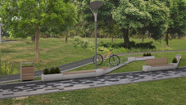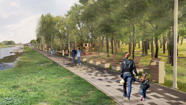 There are wooden platforms for fishing, sunbathing, and socializing on the water. Modern-designed urban furniture is distributed along the entire length of the promenade.