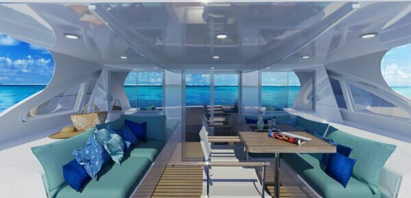 The salon of the catamaran provides a comfortable seating area and a galley with an unobstructed view of the open sea.