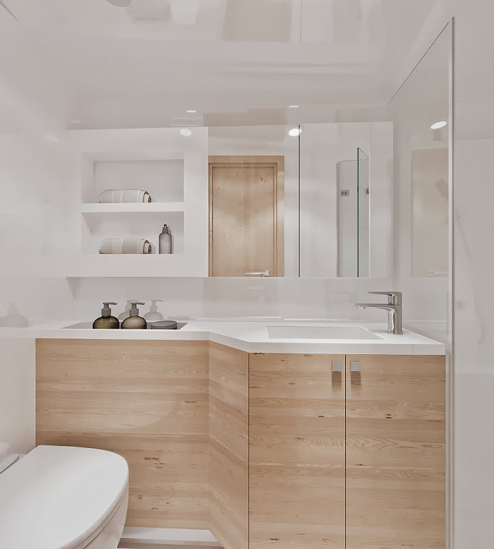 The bathroom is maximally utilized with a custom-made wash basin, which seamlessly fits into the available space, providing ample room for storage and organization. The shower cabin is separated by glass partitions, allowing the remaining space to stay dry.