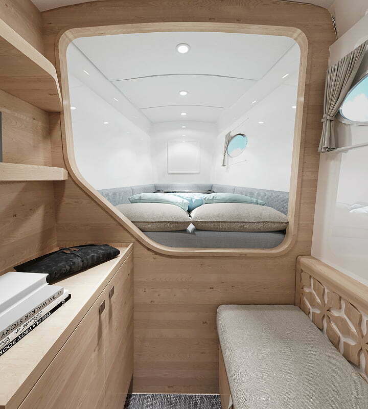 All catamaran cabins are similarly equipped. Although small in size, they are successfully integrated with a desk and a bench with storage space, a wardrobe and a bed for two. The interior of both cabins is dominated by wood, while blue-gray shades are discreetly present, creating a harmonious environment. The embossed trim with a geometric pattern continues from the salon, connecting the entire interior of the ship into a single unit.
