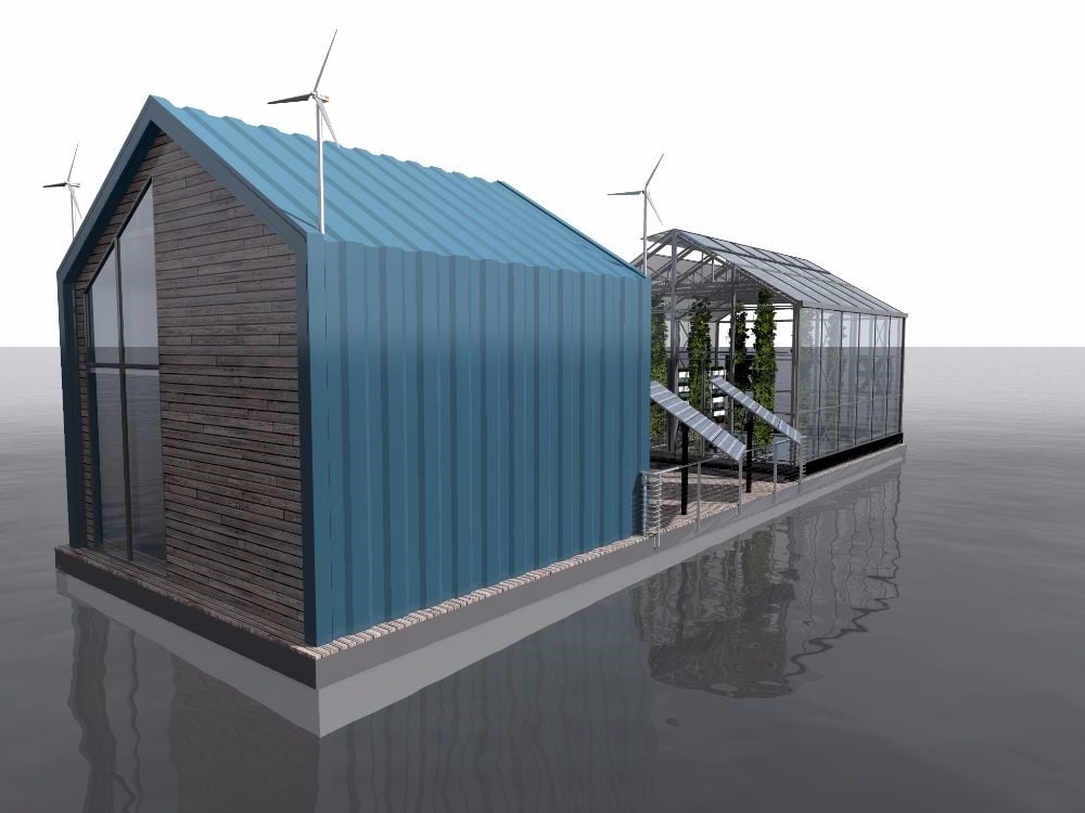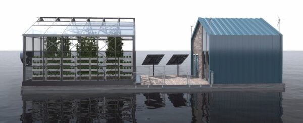 The specific characteristic of this barge is its self-sustainability. There are solar panels on the central terrace that can face the sun always simply by moving the barge. Small windshields are on the roof, producing their energy. Engine power is not needed because the barge is anchored. Although technical rooms inside the barge require some amount of energy, they can be generated by windshields and solar panels.