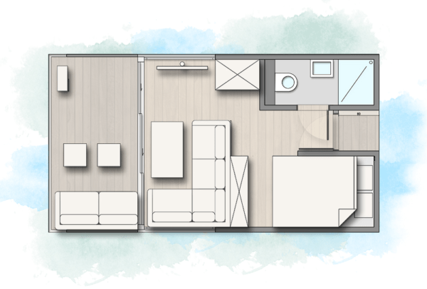 The space is multifunctional as well. Although the apartment is 6.5m long and 3.5m wide, it contains a sleeping area with a double bed. The vacation is spent in a space genuinely connected to water. “The blue mind” effect, the beneficial effect of water for a human mind, is not just possible but unavoidable.